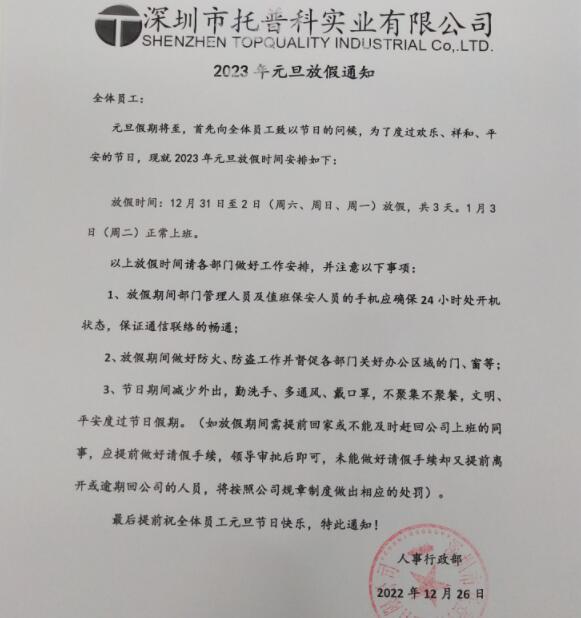深圳托普科實業(yè)2023年元旦放假公告