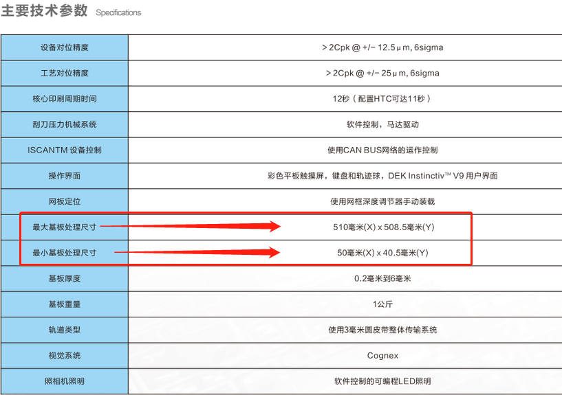 從上圖參數(shù)表上,可以清晰的看到dek 03ix的過板最大和最小尺寸分別是多少。