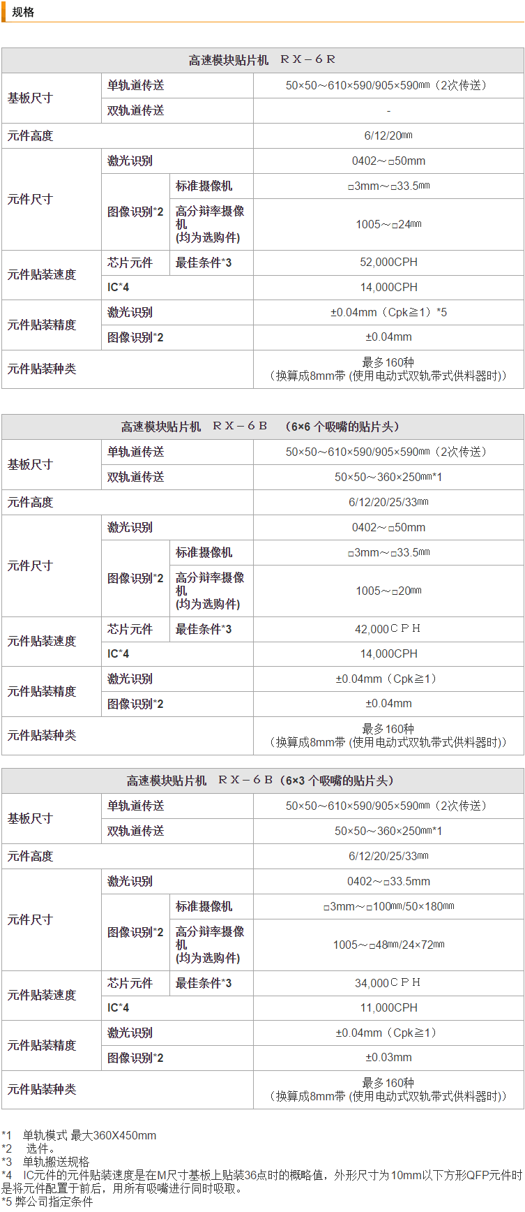 RX-6R是投入在RX-6系列中的新機(jī)型,由于改善了吸嘴上下移動(dòng)的軸、增加了強(qiáng)度、優(yōu)化了貼裝頭的高度等,使貼裝速度與以往機(jī)相比大幅度地提高了24%,達(dá)到52,000CPH(最佳條件)。