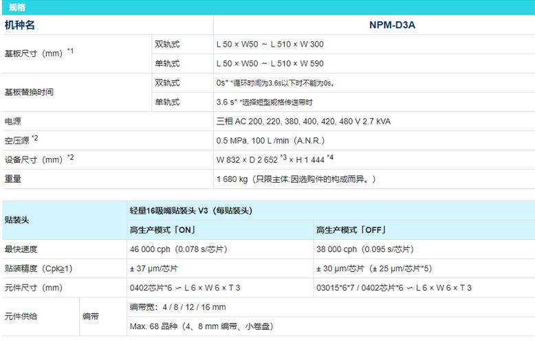 NPM-D3A多功能貼片機改善點: 元件識別動作時同時驅動X-Y軸,通過選擇最佳路徑,從而提高貼裝速度。 驅動控制的進化,縮短X-Z軸的移動時間,從而提高貼裝速度。 改善微小元件的吸附計算方法,提高實效生產率
